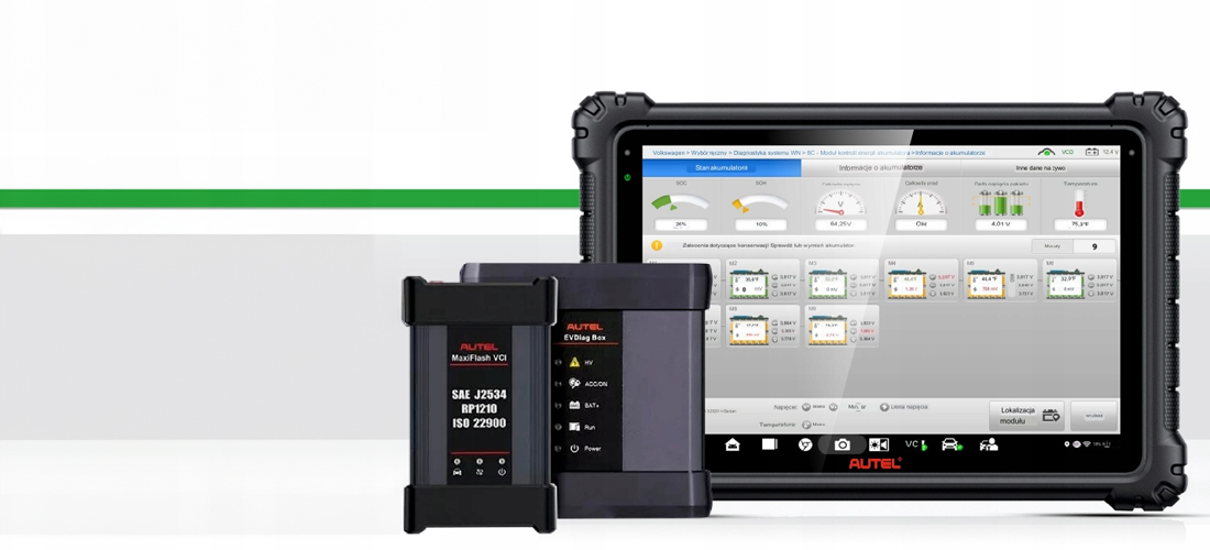 - Autel EV scannt die Komponenten, aus denen ein Hochspannungssystem besteht, liest und behebt Fehlercodes und umfasst Verfahren zum Austausch von Komponenten und Servicefunktionen. Autel EV kann den Zustand der Traktionsbatterie durch Überprüfung der SOC- und SOH-Parameter detailliert analysieren. Die Software liefert Informationen über den Standort der Batterie sowie über die korrekte Handhabung und den Betrieb der Batterie.