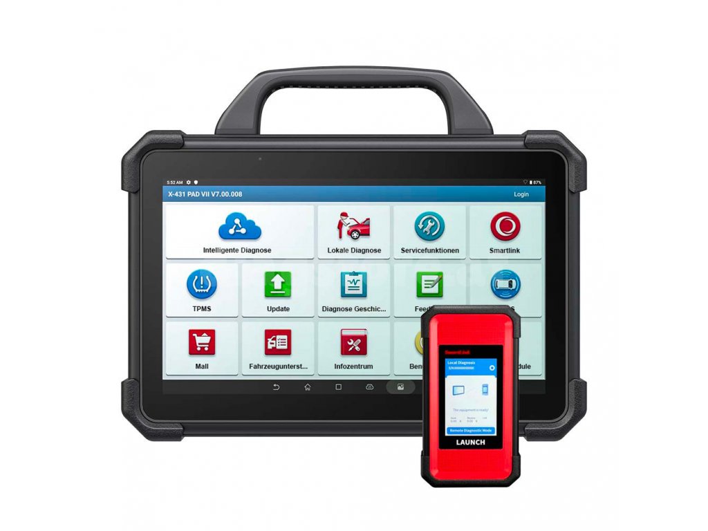 Das Launch X431 PAD VII ist das Flaggschiffmodell von Launch und bietet die meisten Funktionen aller Launch-Produkte. Es ermöglicht die Verbindung zu allen Steuergeräten der meisten europäischen, asiatischen und amerikanischen Fahrzeuge. Das Gerät kann Bereitschaftscodes auslesen und bietet über 50 Servicefunktionen, darunter das Zurücksetzen von Serviceintervallen, die Diagnose und Regeneration des DPF, grundlegende Drosselklappeneinstellungen, das Zurücksetzen von Anpassungen des Automatikgetriebes, grundlegende TPMS-Diagnosen, die Registrierung von Batterien, Einspritzcodierung sowie Schlüssel- und Fernbedienungscodierung und vieles mehr.